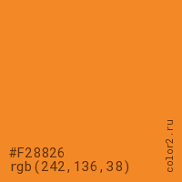 Цвет #F28826 в цветовой модели RGB обозначается тремя октетами (242, 136, 38) в десятичном формате и #F28826 в шестнадцатиричном (hex) формате, которые являются интенсивностью красного 242 (hex F2), интенсивность зелёного 136 (hex 88) и интенсивность синего 38 (hex 26).