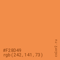 Цвет #F28D49 в цветовой модели RGB обозначается тремя октетами (242, 141, 73) в десятичном формате и #F28D49 в шестнадцатиричном (hex) формате, которые являются интенсивностью красного 242 (hex F2), интенсивность зелёного 141 (hex 8D) и интенсивность синего 73 (hex 49).