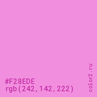 Цвет #F28EDE в цветовой модели RGB обозначается тремя октетами (242, 142, 222) в десятичном формате и #F28EDE в шестнадцатиричном (hex) формате, которые являются интенсивностью красного 242 (hex F2), интенсивность зелёного 142 (hex 8E) и интенсивность синего 222 (hex DE).