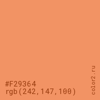 Цвет #F29364 в цветовой модели RGB обозначается тремя октетами (242, 147, 100) в десятичном формате и #F29364 в шестнадцатиричном (hex) формате, которые являются интенсивностью красного 242 (hex F2), интенсивность зелёного 147 (hex 93) и интенсивность синего 100 (hex 64).
