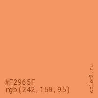 Цвет #F2965F в цветовой модели RGB обозначается тремя октетами (242, 150, 95) в десятичном формате и #F2965F в шестнадцатиричном (hex) формате, которые являются интенсивностью красного 242 (hex F2), интенсивность зелёного 150 (hex 96) и интенсивность синего 95 (hex 5F).