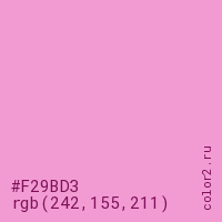 Цвет #F29BD3 в цветовой модели RGB обозначается тремя октетами (242, 155, 211) в десятичном формате и #F29BD3 в шестнадцатиричном (hex) формате, которые являются интенсивностью красного 242 (hex F2), интенсивность зелёного 155 (hex 9B) и интенсивность синего 211 (hex D3).