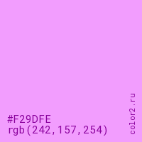 Цвет #F29DFE в цветовой модели RGB обозначается тремя октетами (242, 157, 254) в десятичном формате и #F29DFE в шестнадцатиричном (hex) формате, которые являются интенсивностью красного 242 (hex F2), интенсивность зелёного 157 (hex 9D) и интенсивность синего 254 (hex FE).