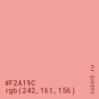 Цвет #F2A19C в цветовой модели RGB обозначается тремя октетами (242, 161, 156) в десятичном формате и #F2A19C в шестнадцатиричном (hex) формате, которые являются интенсивностью красного 242 (hex F2), интенсивность зелёного 161 (hex A1) и интенсивность синего 156 (hex 9C).