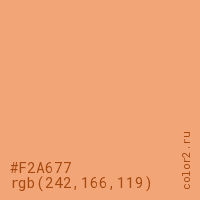 Цвет #F2A677 в цветовой модели RGB обозначается тремя октетами (242, 166, 119) в десятичном формате и #F2A677 в шестнадцатиричном (hex) формате, которые являются интенсивностью красного 242 (hex F2), интенсивность зелёного 166 (hex A6) и интенсивность синего 119 (hex 77).