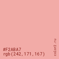 Цвет #F2ABA7 в цветовой модели RGB обозначается тремя октетами (242, 171, 167) в десятичном формате и #F2ABA7 в шестнадцатиричном (hex) формате, которые являются интенсивностью красного 242 (hex F2), интенсивность зелёного 171 (hex AB) и интенсивность синего 167 (hex A7).