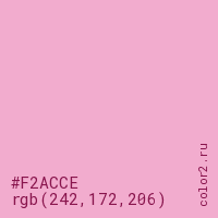 Цвет #F2ACCE в цветовой модели RGB обозначается тремя октетами (242, 172, 206) в десятичном формате и #F2ACCE в шестнадцатиричном (hex) формате, которые являются интенсивностью красного 242 (hex F2), интенсивность зелёного 172 (hex AC) и интенсивность синего 206 (hex CE).