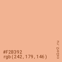 Цвет #F2B392 в цветовой модели RGB обозначается тремя октетами (242, 179, 146) в десятичном формате и #F2B392 в шестнадцатиричном (hex) формате, которые являются интенсивностью красного 242 (hex F2), интенсивность зелёного 179 (hex B3) и интенсивность синего 146 (hex 92).
