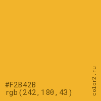 Цвет #F2B42B в цветовой модели RGB обозначается тремя октетами (242, 180, 43) в десятичном формате и #F2B42B в шестнадцатиричном (hex) формате, которые являются интенсивностью красного 242 (hex F2), интенсивность зелёного 180 (hex B4) и интенсивность синего 43 (hex 2B).