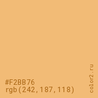 Цвет #F2BB76 в цветовой модели RGB обозначается тремя октетами (242, 187, 118) в десятичном формате и #F2BB76 в шестнадцатиричном (hex) формате, которые являются интенсивностью красного 242 (hex F2), интенсивность зелёного 187 (hex BB) и интенсивность синего 118 (hex 76).