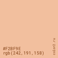 Цвет #F2BF9E в цветовой модели RGB обозначается тремя октетами (242, 191, 158) в десятичном формате и #F2BF9E в шестнадцатиричном (hex) формате, которые являются интенсивностью красного 242 (hex F2), интенсивность зелёного 191 (hex BF) и интенсивность синего 158 (hex 9E).