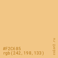 Цвет #F2C685 в цветовой модели RGB обозначается тремя октетами (242, 198, 133) в десятичном формате и #F2C685 в шестнадцатиричном (hex) формате, которые являются интенсивностью красного 242 (hex F2), интенсивность зелёного 198 (hex C6) и интенсивность синего 133 (hex 85).