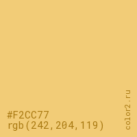 Цвет #F2CC77 в цветовой модели RGB обозначается тремя октетами (242, 204, 119) в десятичном формате и #F2CC77 в шестнадцатиричном (hex) формате, которые являются интенсивностью красного 242 (hex F2), интенсивность зелёного 204 (hex CC) и интенсивность синего 119 (hex 77).