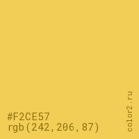 Цвет #F2CE57 в цветовой модели RGB обозначается тремя октетами (242, 206, 87) в десятичном формате и #F2CE57 в шестнадцатиричном (hex) формате, которые являются интенсивностью красного 242 (hex F2), интенсивность зелёного 206 (hex CE) и интенсивность синего 87 (hex 57).