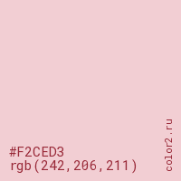 Цвет #F2CED3 в цветовой модели RGB обозначается тремя октетами (242, 206, 211) в десятичном формате и #F2CED3 в шестнадцатиричном (hex) формате, которые являются интенсивностью красного 242 (hex F2), интенсивность зелёного 206 (hex CE) и интенсивность синего 211 (hex D3).