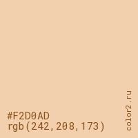 Цвет #F2D0AD в цветовой модели RGB обозначается тремя октетами (242, 208, 173) в десятичном формате и #F2D0AD в шестнадцатиричном (hex) формате, которые являются интенсивностью красного 242 (hex F2), интенсивность зелёного 208 (hex D0) и интенсивность синего 173 (hex AD).