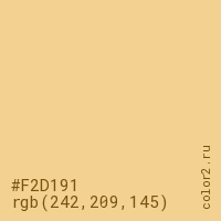 Цвет #F2D191 в цветовой модели RGB обозначается тремя октетами (242, 209, 145) в десятичном формате и #F2D191 в шестнадцатиричном (hex) формате, которые являются интенсивностью красного 242 (hex F2), интенсивность зелёного 209 (hex D1) и интенсивность синего 145 (hex 91).