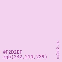 Цвет #F2D2EF в цветовой модели RGB обозначается тремя октетами (242, 210, 239) в десятичном формате и #F2D2EF в шестнадцатиричном (hex) формате, которые являются интенсивностью красного 242 (hex F2), интенсивность зелёного 210 (hex D2) и интенсивность синего 239 (hex EF).