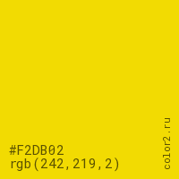 Цвет #F2DB02 в цветовой модели RGB обозначается тремя октетами (242, 219, 2) в десятичном формате и #F2DB02 в шестнадцатиричном (hex) формате, которые являются интенсивностью красного 242 (hex F2), интенсивность зелёного 219 (hex DB) и интенсивность синего 2 (hex 02).