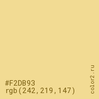 Цвет #F2DB93 в цветовой модели RGB обозначается тремя октетами (242, 219, 147) в десятичном формате и #F2DB93 в шестнадцатиричном (hex) формате, которые являются интенсивностью красного 242 (hex F2), интенсивность зелёного 219 (hex DB) и интенсивность синего 147 (hex 93).