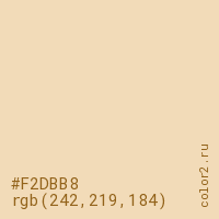 Цвет #F2DBB8 в цветовой модели RGB обозначается тремя октетами (242, 219, 184) в десятичном формате и #F2DBB8 в шестнадцатиричном (hex) формате, которые являются интенсивностью красного 242 (hex F2), интенсивность зелёного 219 (hex DB) и интенсивность синего 184 (hex B8).