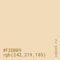 Цвет #F2DBB9 в цветовой модели RGB обозначается тремя октетами (242, 219, 185) в десятичном формате и #F2DBB9 в шестнадцатиричном (hex) формате, которые являются интенсивностью красного 242 (hex F2), интенсивность зелёного 219 (hex DB) и интенсивность синего 185 (hex B9).