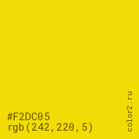 Цвет #F2DC05 в цветовой модели RGB обозначается тремя октетами (242, 220, 5) в десятичном формате и #F2DC05 в шестнадцатиричном (hex) формате, которые являются интенсивностью красного 242 (hex F2), интенсивность зелёного 220 (hex DC) и интенсивность синего 5 (hex 05).