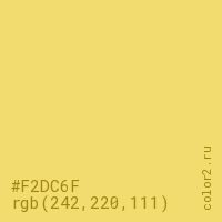 Цвет #F2DC6F в цветовой модели RGB обозначается тремя октетами (242, 220, 111) в десятичном формате и #F2DC6F в шестнадцатиричном (hex) формате, которые являются интенсивностью красного 242 (hex F2), интенсивность зелёного 220 (hex DC) и интенсивность синего 111 (hex 6F).