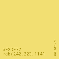 Цвет #F2DF72 в цветовой модели RGB обозначается тремя октетами (242, 223, 114) в десятичном формате и #F2DF72 в шестнадцатиричном (hex) формате, которые являются интенсивностью красного 242 (hex F2), интенсивность зелёного 223 (hex DF) и интенсивность синего 114 (hex 72).
