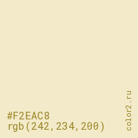 Цвет #F2EAC8 в цветовой модели RGB обозначается тремя октетами (242, 234, 200) в десятичном формате и #F2EAC8 в шестнадцатиричном (hex) формате, которые являются интенсивностью красного 242 (hex F2), интенсивность зелёного 234 (hex EA) и интенсивность синего 200 (hex C8).