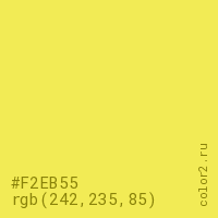 Цвет #F2EB55 в цветовой модели RGB обозначается тремя октетами (242, 235, 85) в десятичном формате и #F2EB55 в шестнадцатиричном (hex) формате, которые являются интенсивностью красного 242 (hex F2), интенсивность зелёного 235 (hex EB) и интенсивность синего 85 (hex 55).