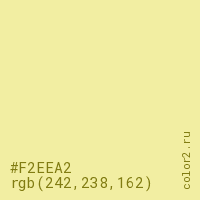 Цвет #F2EEA2 в цветовой модели RGB обозначается тремя октетами (242, 238, 162) в десятичном формате и #F2EEA2 в шестнадцатиричном (hex) формате, которые являются интенсивностью красного 242 (hex F2), интенсивность зелёного 238 (hex EE) и интенсивность синего 162 (hex A2).