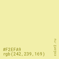 Цвет #F2EFA9 в цветовой модели RGB обозначается тремя октетами (242, 239, 169) в десятичном формате и #F2EFA9 в шестнадцатиричном (hex) формате, которые являются интенсивностью красного 242 (hex F2), интенсивность зелёного 239 (hex EF) и интенсивность синего 169 (hex A9).