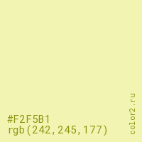 Цвет #F2F5B1 в цветовой модели RGB обозначается тремя октетами (242, 245, 177) в десятичном формате и #F2F5B1 в шестнадцатиричном (hex) формате, которые являются интенсивностью красного 242 (hex F2), интенсивность зелёного 245 (hex F5) и интенсивность синего 177 (hex B1).