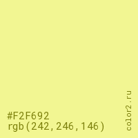 Цвет #F2F692 в цветовой модели RGB обозначается тремя октетами (242, 246, 146) в десятичном формате и #F2F692 в шестнадцатиричном (hex) формате, которые являются интенсивностью красного 242 (hex F2), интенсивность зелёного 246 (hex F6) и интенсивность синего 146 (hex 92).