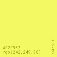 Цвет #F2F962 в цветовой модели RGB обозначается тремя октетами (242, 249, 98) в десятичном формате и #F2F962 в шестнадцатиричном (hex) формате, которые являются интенсивностью красного 242 (hex F2), интенсивность зелёного 249 (hex F9) и интенсивность синего 98 (hex 62).