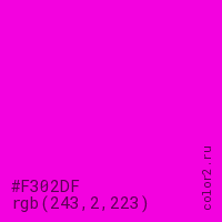 Цвет #F302DF в цветовой модели RGB обозначается тремя октетами (243, 2, 223) в десятичном формате и #F302DF в шестнадцатиричном (hex) формате, которые являются интенсивностью красного 243 (hex F3), интенсивность зелёного 2 (hex 02) и интенсивность синего 223 (hex DF).