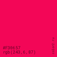 Цвет #F30657 в цветовой модели RGB обозначается тремя октетами (243, 6, 87) в десятичном формате и #F30657 в шестнадцатиричном (hex) формате, которые являются интенсивностью красного 243 (hex F3), интенсивность зелёного 6 (hex 06) и интенсивность синего 87 (hex 57).