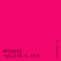Цвет #F3066B в цветовой модели RGB обозначается тремя октетами (243, 6, 107) в десятичном формате и #F3066B в шестнадцатиричном (hex) формате, которые являются интенсивностью красного 243 (hex F3), интенсивность зелёного 6 (hex 06) и интенсивность синего 107 (hex 6B).