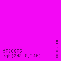 Цвет #F308F5 в цветовой модели RGB обозначается тремя октетами (243, 8, 245) в десятичном формате и #F308F5 в шестнадцатиричном (hex) формате, которые являются интенсивностью красного 243 (hex F3), интенсивность зелёного 8 (hex 08) и интенсивность синего 245 (hex F5).