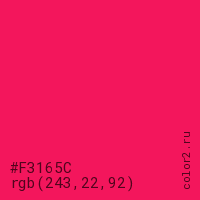 Цвет #F3165C в цветовой модели RGB обозначается тремя октетами (243, 22, 92) в десятичном формате и #F3165C в шестнадцатиричном (hex) формате, которые являются интенсивностью красного 243 (hex F3), интенсивность зелёного 22 (hex 16) и интенсивность синего 92 (hex 5C).