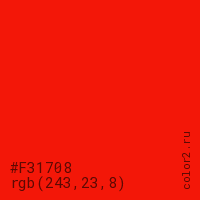Цвет #F31708 в цветовой модели RGB обозначается тремя октетами (243, 23, 8) в десятичном формате и #F31708 в шестнадцатиричном (hex) формате, которые являются интенсивностью красного 243 (hex F3), интенсивность зелёного 23 (hex 17) и интенсивность синего 8 (hex 08).