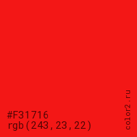 Цвет #F31716 в цветовой модели RGB обозначается тремя октетами (243, 23, 22) в десятичном формате и #F31716 в шестнадцатиричном (hex) формате, которые являются интенсивностью красного 243 (hex F3), интенсивность зелёного 23 (hex 17) и интенсивность синего 22 (hex 16).