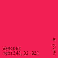 Цвет #F32052 в цветовой модели RGB обозначается тремя октетами (243, 32, 82) в десятичном формате и #F32052 в шестнадцатиричном (hex) формате, которые являются интенсивностью красного 243 (hex F3), интенсивность зелёного 32 (hex 20) и интенсивность синего 82 (hex 52).