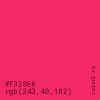 Цвет #F32866 в цветовой модели RGB обозначается тремя октетами (243, 40, 102) в десятичном формате и #F32866 в шестнадцатиричном (hex) формате, которые являются интенсивностью красного 243 (hex F3), интенсивность зелёного 40 (hex 28) и интенсивность синего 102 (hex 66).