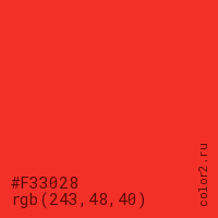 Цвет #F33028 в цветовой модели RGB обозначается тремя октетами (243, 48, 40) в десятичном формате и #F33028 в шестнадцатиричном (hex) формате, которые являются интенсивностью красного 243 (hex F3), интенсивность зелёного 48 (hex 30) и интенсивность синего 40 (hex 28).