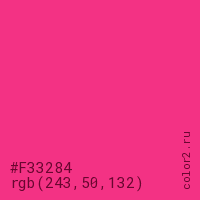 Цвет #F33284 в цветовой модели RGB обозначается тремя октетами (243, 50, 132) в десятичном формате и #F33284 в шестнадцатиричном (hex) формате, которые являются интенсивностью красного 243 (hex F3), интенсивность зелёного 50 (hex 32) и интенсивность синего 132 (hex 84).