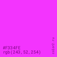 Цвет #F334FE в цветовой модели RGB обозначается тремя октетами (243, 52, 254) в десятичном формате и #F334FE в шестнадцатиричном (hex) формате, которые являются интенсивностью красного 243 (hex F3), интенсивность зелёного 52 (hex 34) и интенсивность синего 254 (hex FE).