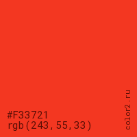Цвет #F33721 в цветовой модели RGB обозначается тремя октетами (243, 55, 33) в десятичном формате и #F33721 в шестнадцатиричном (hex) формате, которые являются интенсивностью красного 243 (hex F3), интенсивность зелёного 55 (hex 37) и интенсивность синего 33 (hex 21).