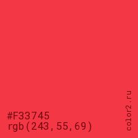 Цвет #F33745 в цветовой модели RGB обозначается тремя октетами (243, 55, 69) в десятичном формате и #F33745 в шестнадцатиричном (hex) формате, которые являются интенсивностью красного 243 (hex F3), интенсивность зелёного 55 (hex 37) и интенсивность синего 69 (hex 45).